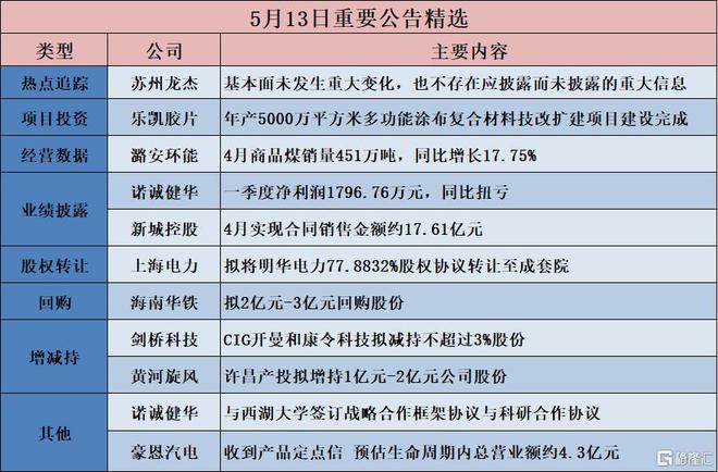 东山精密(002384.SZ):拟收购法国GMD集团100%股权并对其进行债务重组回购海南华铁(603300.SH):拟2亿元-3亿元回购股份【增减持